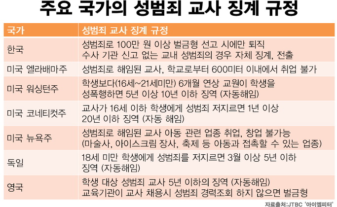교사가 학생을 대상으로 성범죄를 저지르는 행위 자체를 엄중하게 다루는 다른 나라에 비해, 한국은 수사기관의 신고가 없는 교내 성범죄는 대부분 자체 징계나 다른 학교로의 전출로 끝나는 경우가 많습니다.
