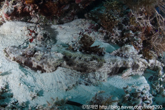 모래 바닥에 납작 엎드려 있는 크로커다일피쉬 (Crocodilefish) ⓒ장재연