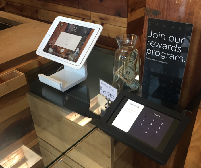 스퀘어의 아이패드 카드결제기와 Fivestars라는 스타트업의 리워드시스템을 사용하는 샌프란시스코의 커피숍.
